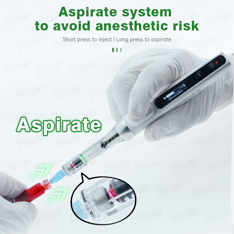 The Aspirate Anaesthetic Pen features a proactive aspiration safety function: hold to visually confirm needle placement (blood indicates vascular entry), preventing intravascular injection. It ensures pain-free delivery via smart pressure control, in a 73g ultra-lightweight, Type-C rechargeable, and 135°C autoclavable design for safe, comfortable, and efficient practice use.